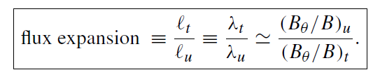 Magnetic flux expansion as defined by Stangeby : ratio between the poloidal field at the midplane separatrix and the poloidal field at the strike-point see formula attached, where u means upstream (midplane separatrix) and t means at divertor target (downstream).